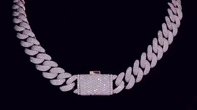 A vision in rose gold. A Miami Cuban, solid and heavy, iced with hand-set diamonds. Crafted to their size, their dream chain brought to life.